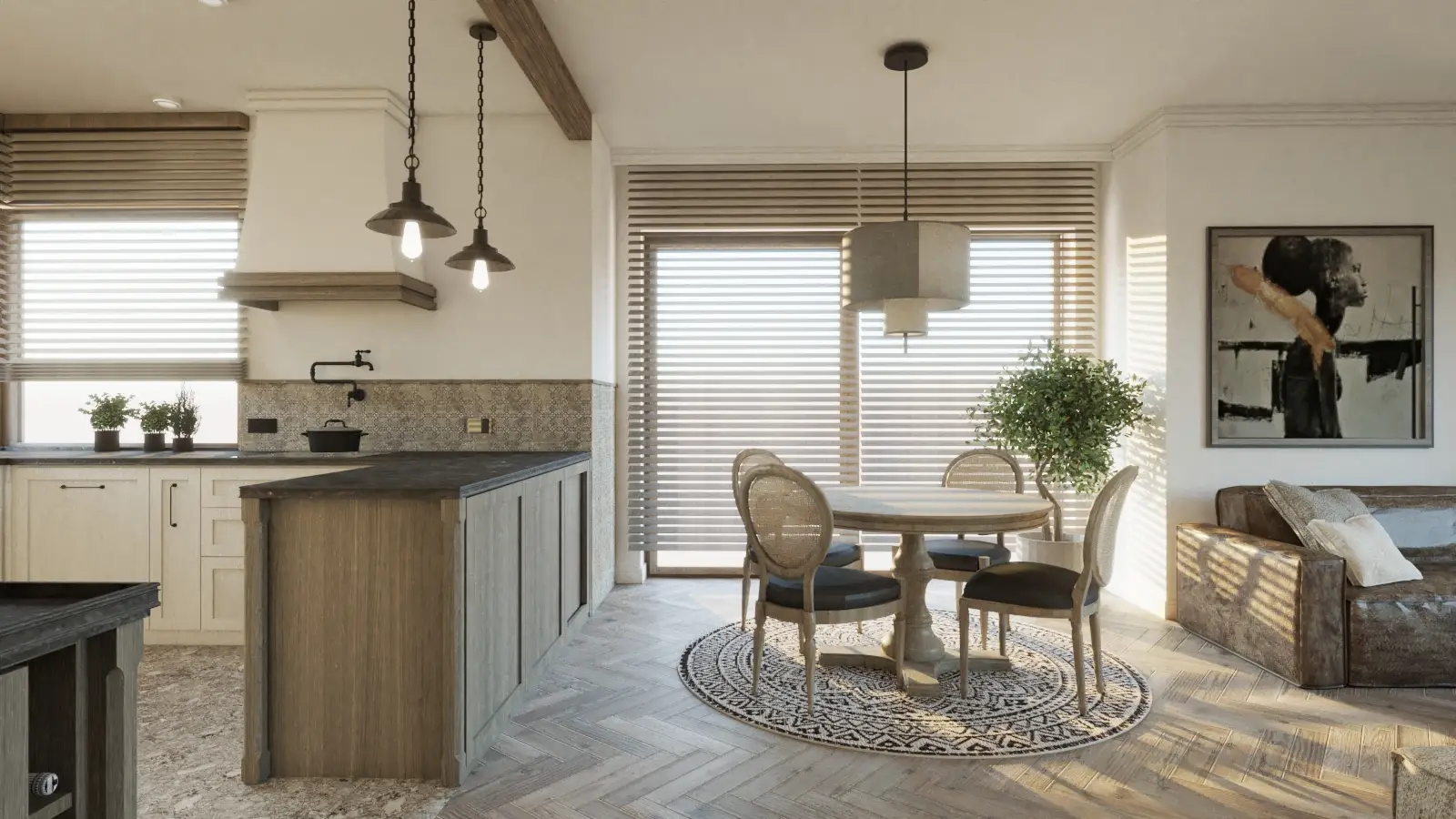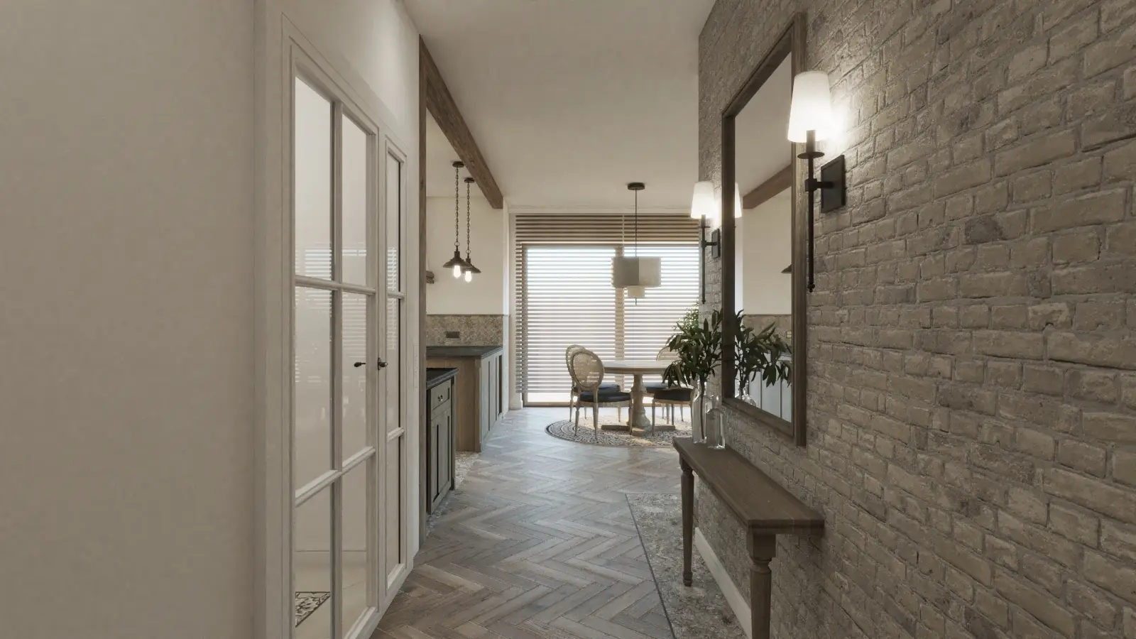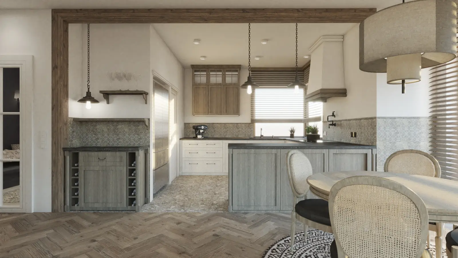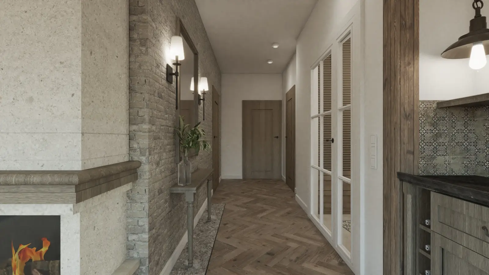 Ten dom w stylu modern farmhouse powstał z myślą o parze, która marzyła o przytulnym wnętrzu inspirowanym klimatem słonecznej Toskanii, z kuchnią w roli serca domu i otwartą przestrzenią dzienną z widokiem na ogród. Już w wiatrołapie uwagę przyciągają kamienne płytki ułożone w rzymskim wzorze oraz wyrazisty akcent kolorystyczny – granatowa wnęka z siedziskiem. Oś widokową korytarza zamyka ceglana ściana z konsolą, lustrem i nastrojowym oświetleniem, która wprowadza ciepły, rustykalny klimat. W strefie dziennej znajduje się okrągły stół przy oknie balkonowym, kominek, wygodny narożnik oraz subtelna zabudowa RTV, tworząc przestrzeń do wypoczynku i spotkań. Stylizowana kuchnia z kamiennym blatem, drewnianymi frontami, ukrytą spiżarnią i dekoracyjnym okapem łączy funkcjonalność z dopracowaną estetyką. Spójność całego projektu zapewniają naturalne materiały – drewniana jodełka, trawertyn, jasne tynki, plecione tkaniny i żaluzje, które nadają wnętrzu ciepło, strukturę i ponadczasowy charakter.