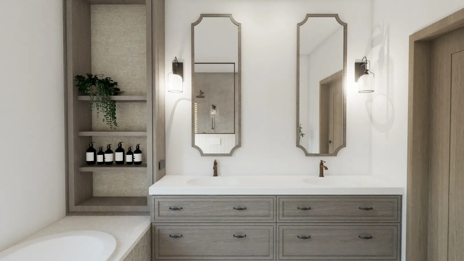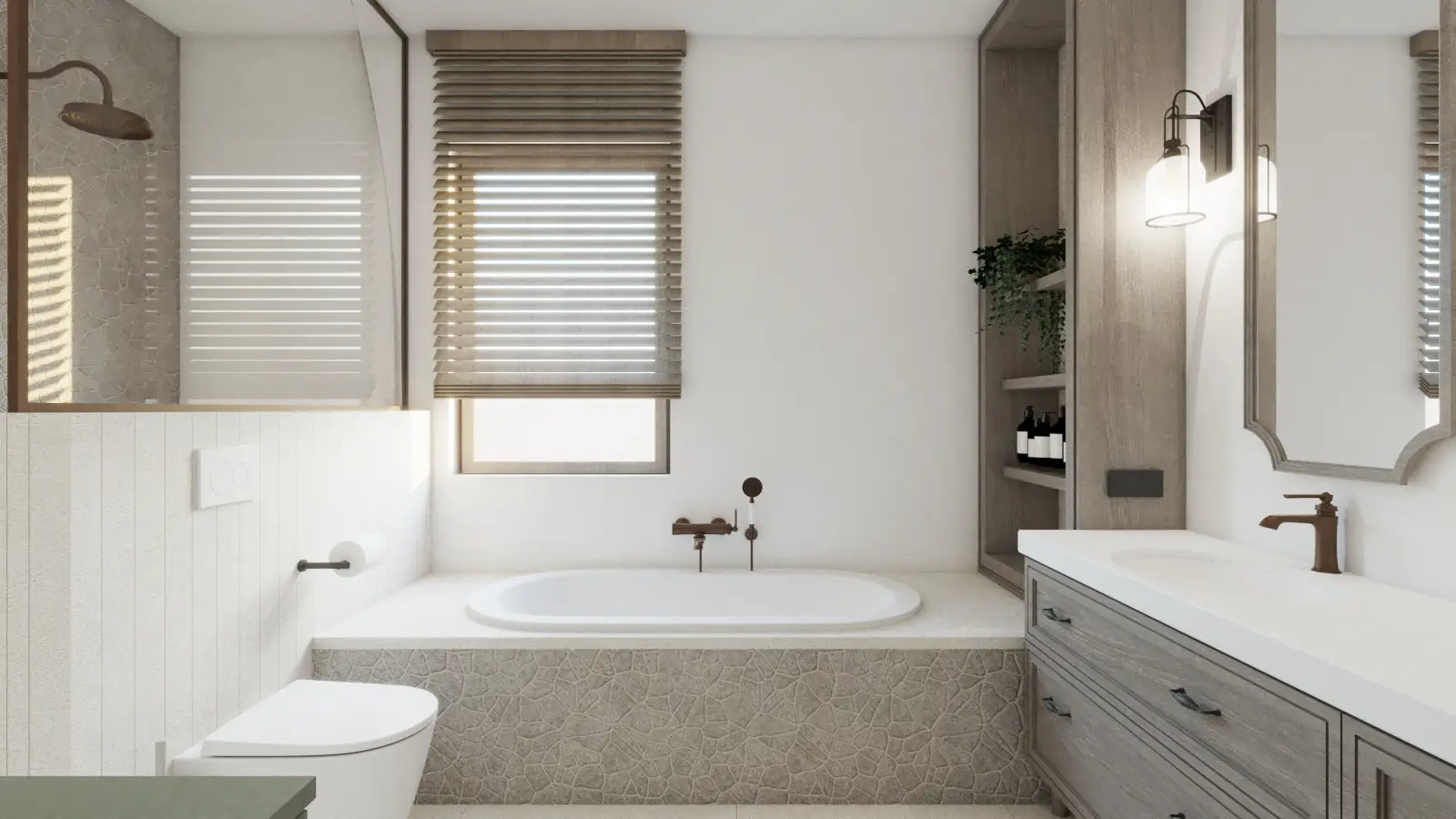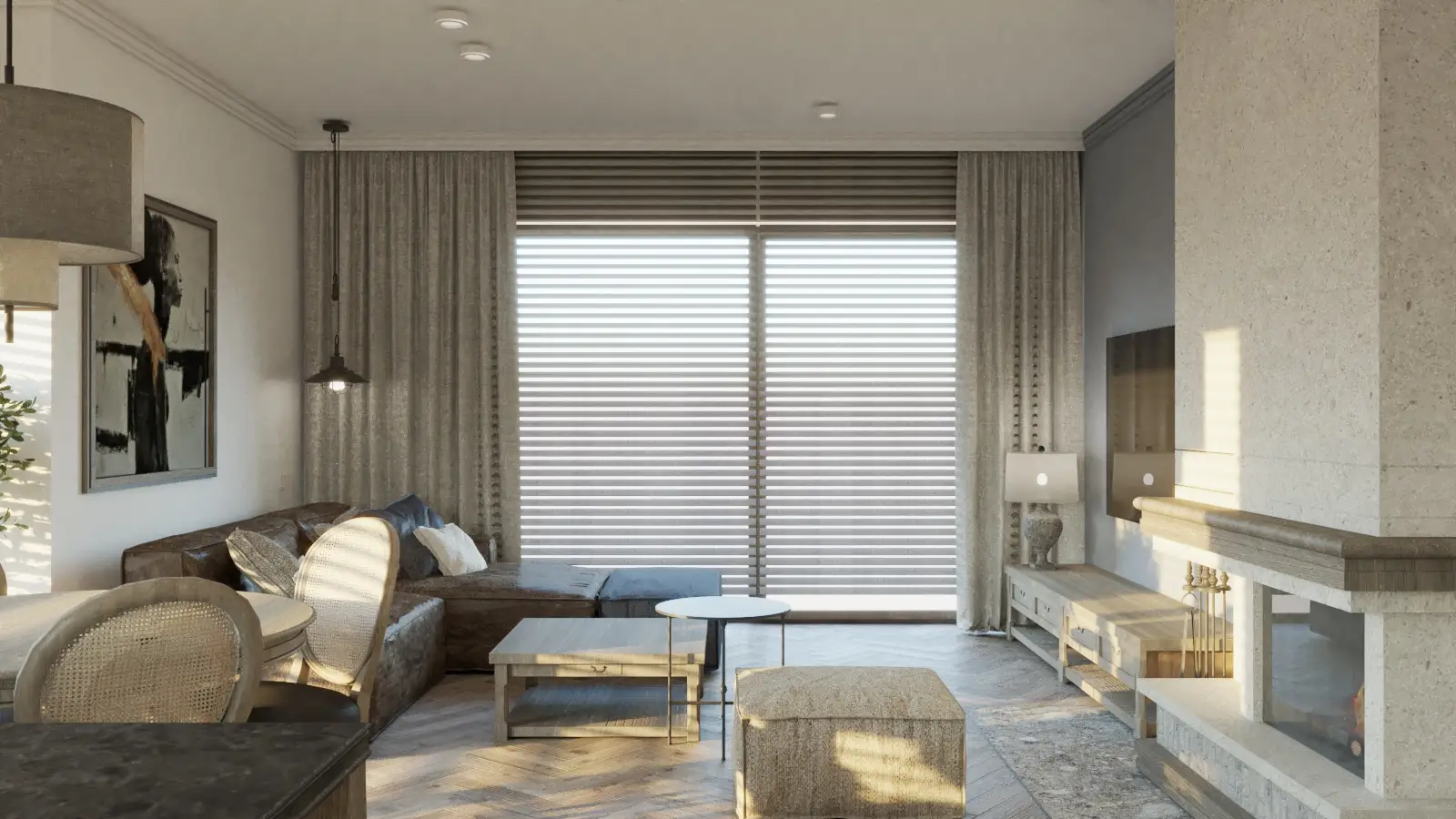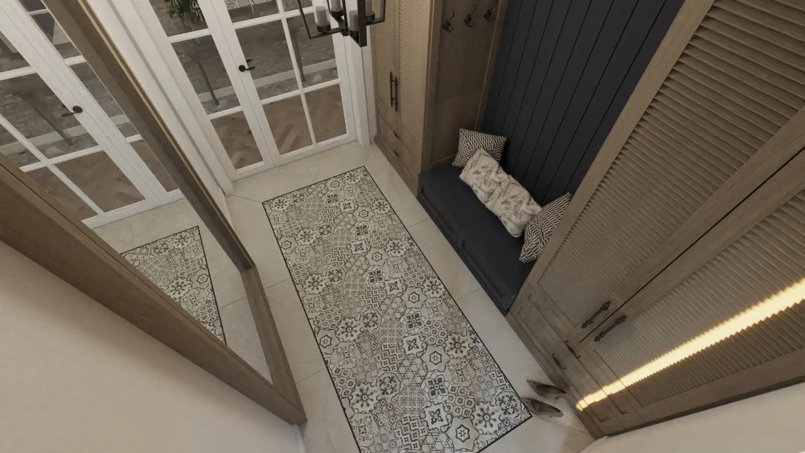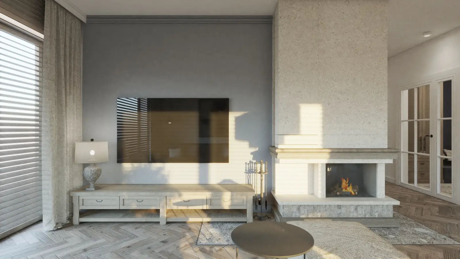 Ten dom w stylu modern farmhouse powstał z myślą o parze, która marzyła o przytulnym wnętrzu inspirowanym klimatem słonecznej Toskanii, z kuchnią w roli serca domu i otwartą przestrzenią dzienną z widokiem na ogród. Już w wiatrołapie uwagę przyciągają kamienne płytki ułożone w rzymskim wzorze oraz wyrazisty akcent kolorystyczny – granatowa wnęka z siedziskiem. Oś widokową korytarza zamyka ceglana ściana z konsolą, lustrem i nastrojowym oświetleniem, która wprowadza ciepły, rustykalny klimat. W strefie dziennej znajduje się okrągły stół przy oknie balkonowym, kominek, wygodny narożnik oraz subtelna zabudowa RTV, tworząc przestrzeń do wypoczynku i spotkań. Stylizowana kuchnia z kamiennym blatem, drewnianymi frontami, ukrytą spiżarnią i dekoracyjnym okapem łączy funkcjonalność z dopracowaną estetyką. Spójność całego projektu zapewniają naturalne materiały – drewniana jodełka, trawertyn, jasne tynki, plecione tkaniny i żaluzje, które nadają wnętrzu ciepło, strukturę i ponadczasowy charakter.