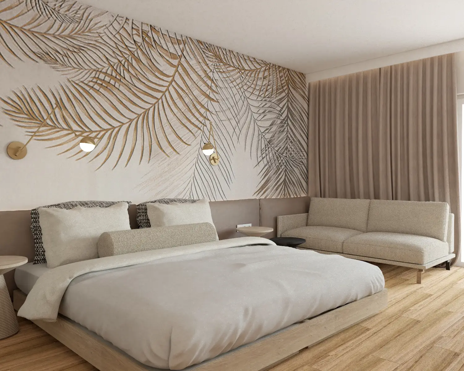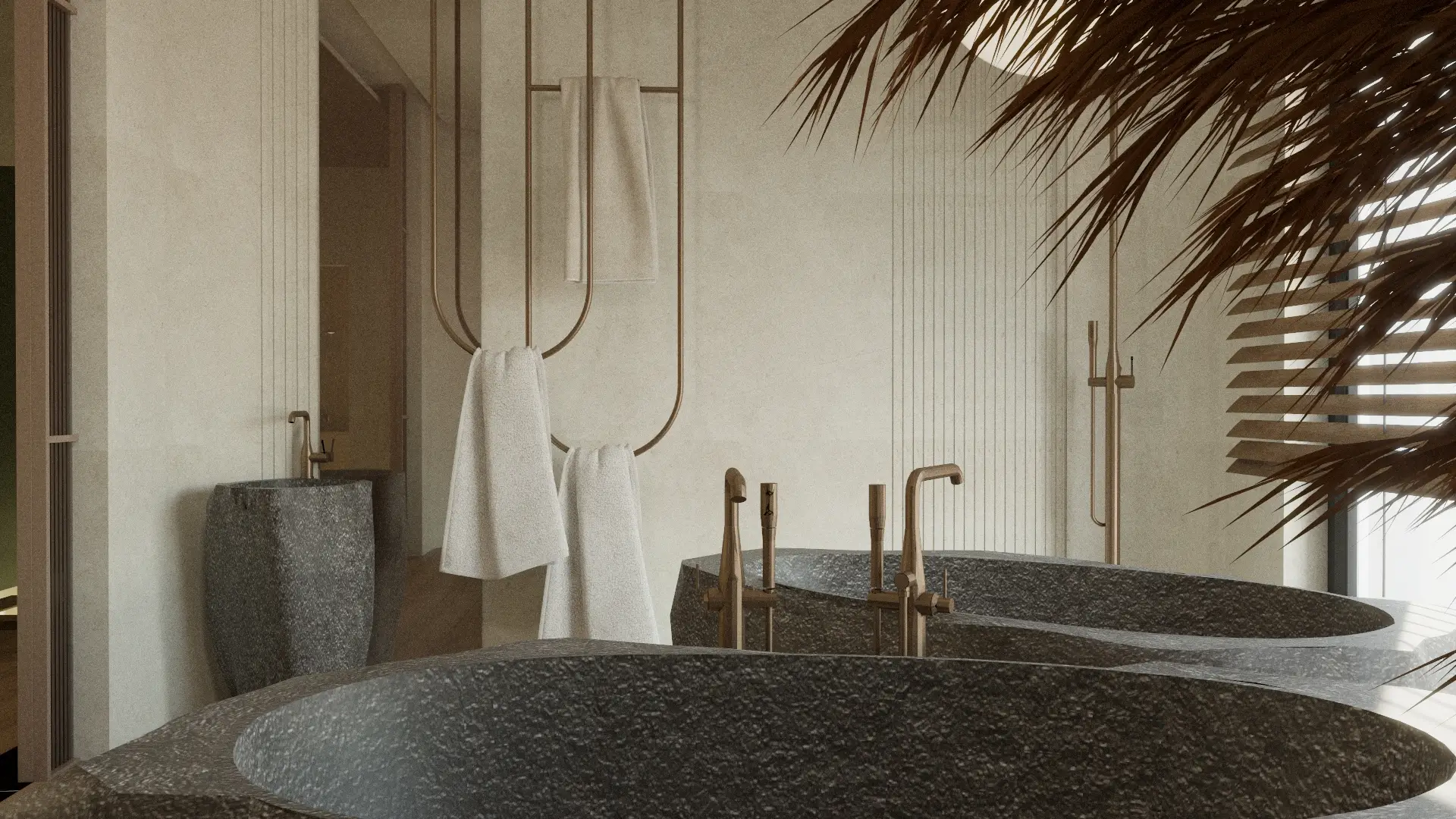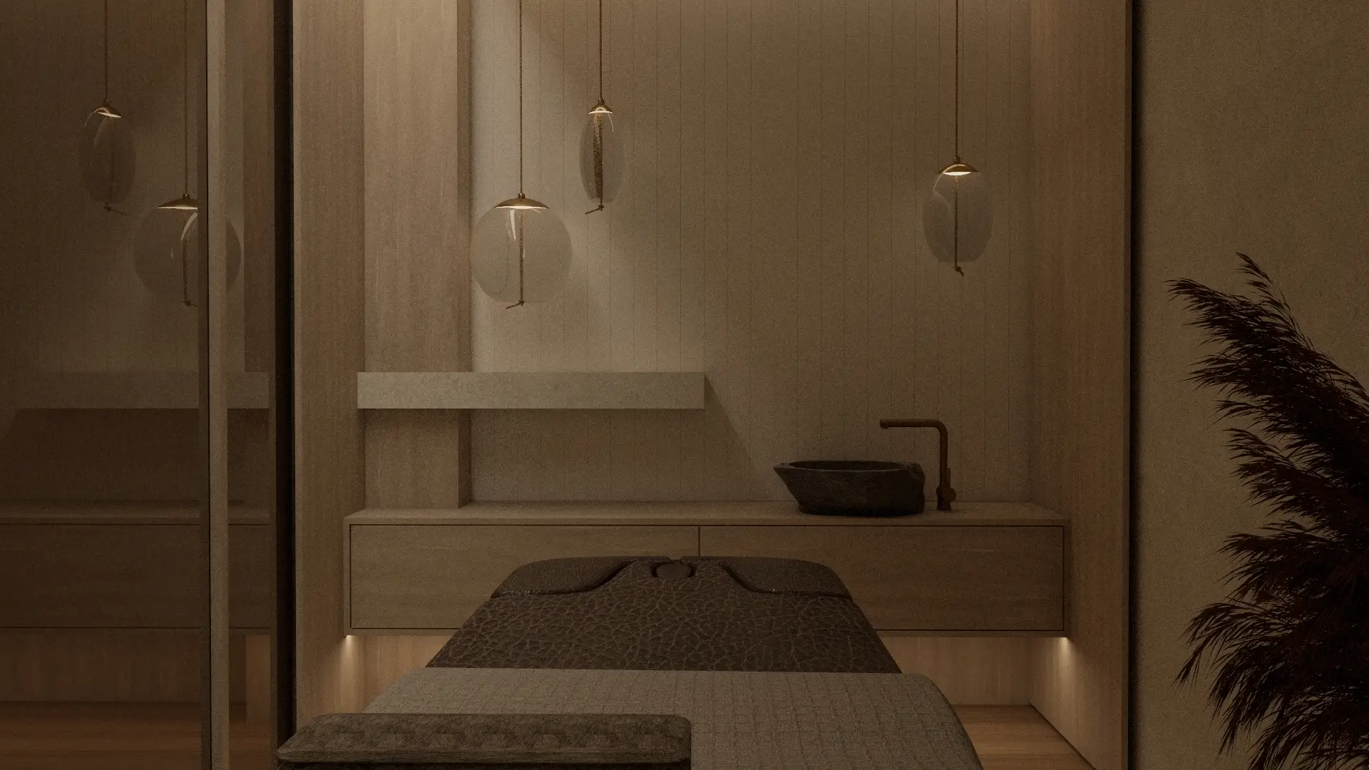 Projekt wnętrz dla Hotelu Binkowski obejmował koncepcję strefy SPA oraz pokoi hotelowych, łącząc naturalne materiały z ciepłą, przytulną atmosferą. W pokojach postawiono na delikatny styl boho – pojawiają się tu rattanowe lampy, miękkie tekstylia oraz tapety z motywem palmowych liści, które wprowadzają relaksujący, wakacyjny klimat. Recepcja SPA już od progu zapowiada charakter miejsca – drewno na suficie, podłodze i ścianach kontrastuje z jasnobeżowym tynkiem, tworząc spójną i naturalną kompozycję. Klimat przestrzeni budują również duże rośliny doniczkowe oraz starannie dobrane oświetlenie, nadające całości egzotyczny wyraz. Punktem centralnym strefy relaksu jest gabinet kąpielowy z dwiema wannami wykonanymi z brazylijskiego kamienia rzecznego, osadzonymi na podeście z jasnego kamienia. Zaokrąglone narożniki ścian, podłogi z egzotycznego drewna oraz nastrojowe światło sprawiają, że przestrzeń koi zmysły i sprzyja głębokiemu wypoczynkowi.