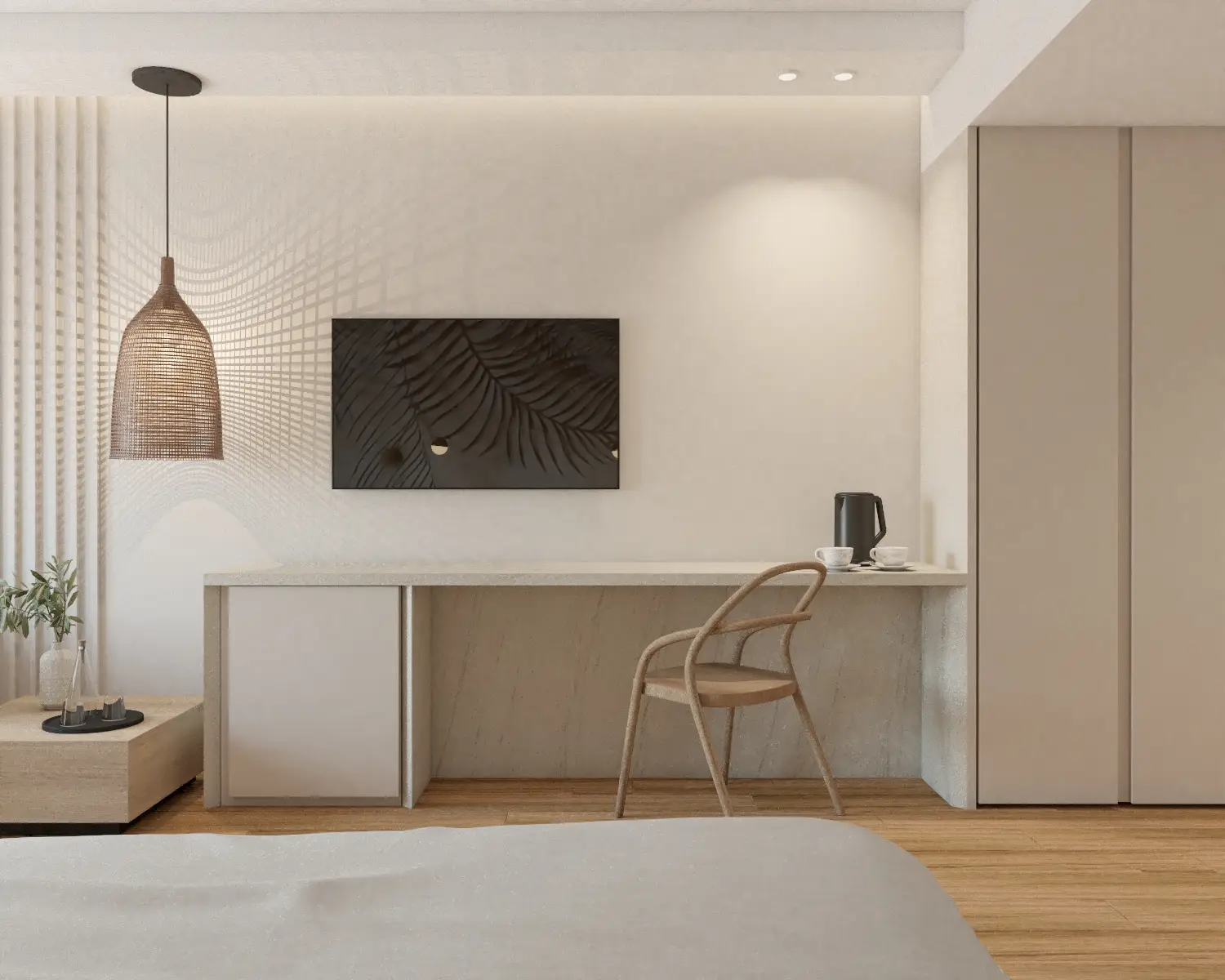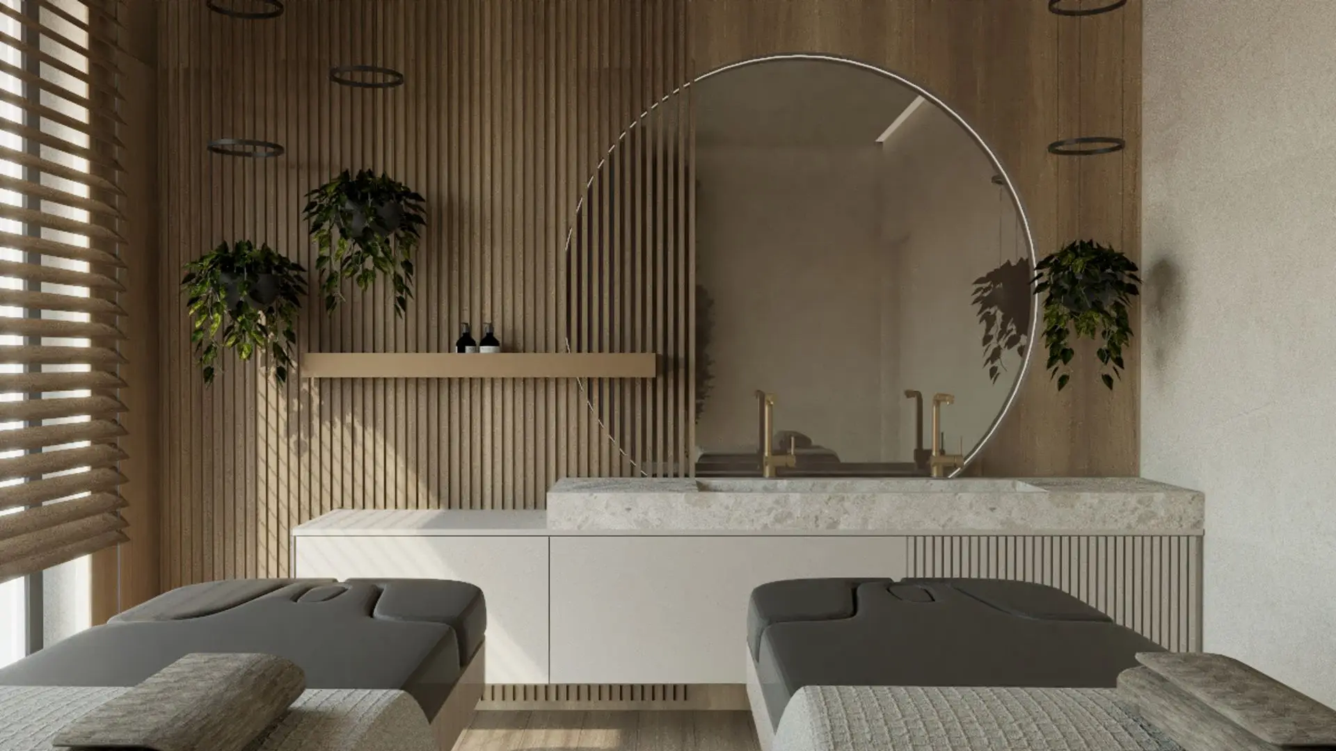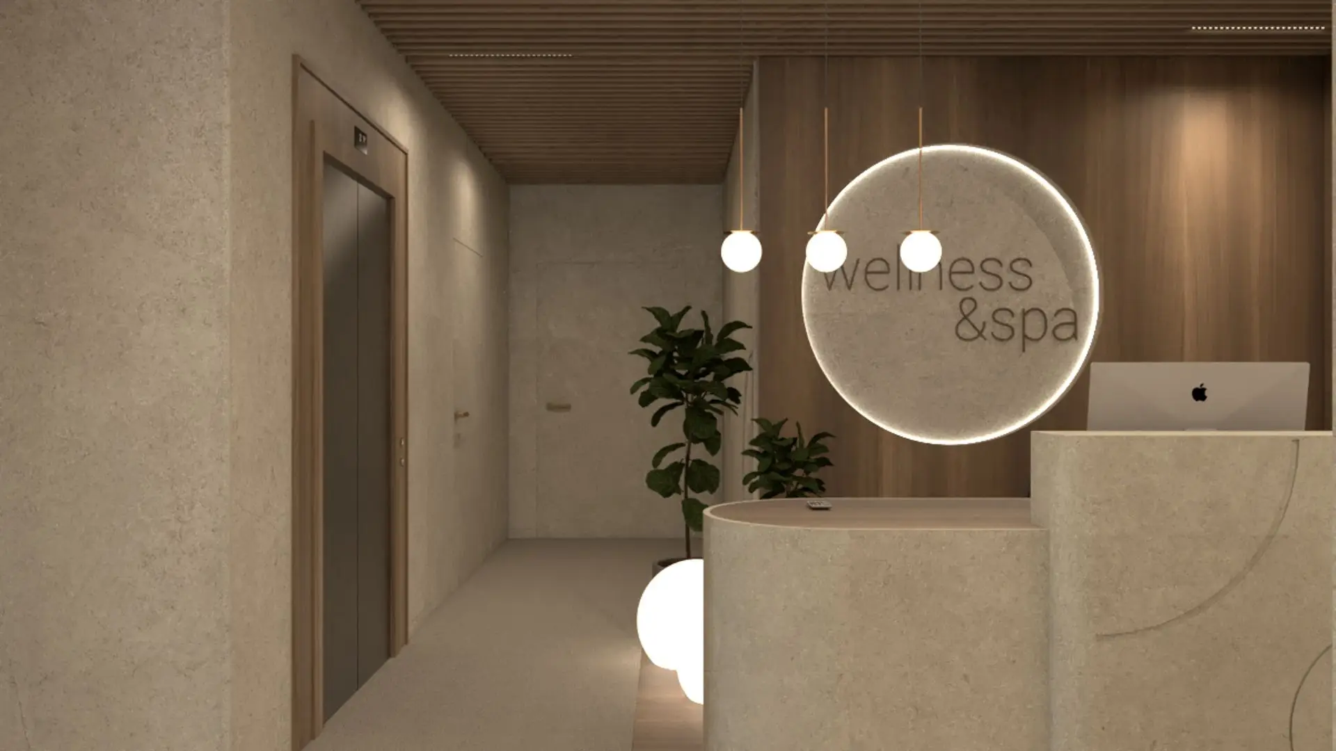 Projekt wnętrz dla Hotelu Binkowski obejmował koncepcję strefy SPA oraz pokoi hotelowych, łącząc naturalne materiały z ciepłą, przytulną atmosferą. W pokojach postawiono na delikatny styl boho – pojawiają się tu rattanowe lampy, miękkie tekstylia oraz tapety z motywem palmowych liści, które wprowadzają relaksujący, wakacyjny klimat. Recepcja SPA już od progu zapowiada charakter miejsca – drewno na suficie, podłodze i ścianach kontrastuje z jasnobeżowym tynkiem, tworząc spójną i naturalną kompozycję. Klimat przestrzeni budują również duże rośliny doniczkowe oraz starannie dobrane oświetlenie, nadające całości egzotyczny wyraz. Punktem centralnym strefy relaksu jest gabinet kąpielowy z dwiema wannami wykonanymi z brazylijskiego kamienia rzecznego, osadzonymi na podeście z jasnego kamienia. Zaokrąglone narożniki ścian, podłogi z egzotycznego drewna oraz nastrojowe światło sprawiają, że przestrzeń koi zmysły i sprzyja głębokiemu wypoczynkowi.