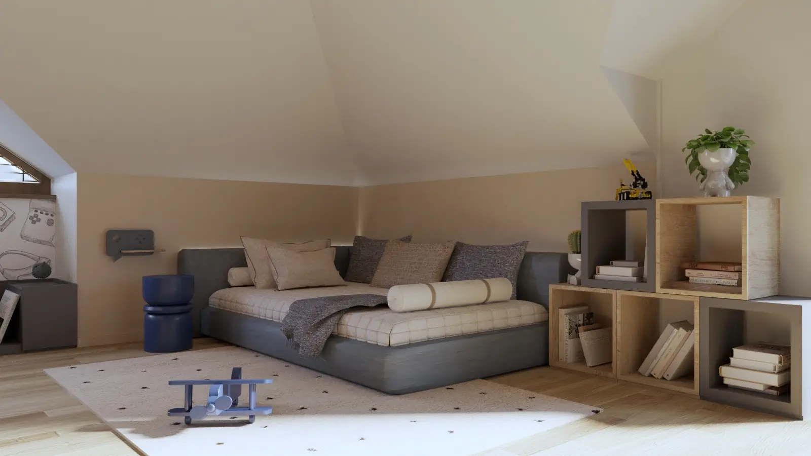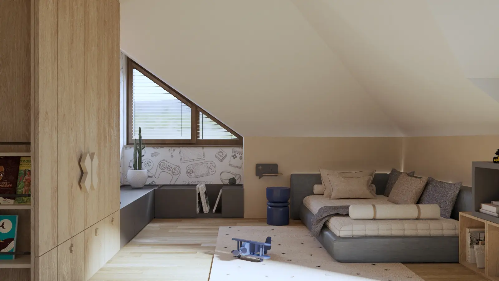 Pokój z motywem gamingowym został zaprojektowany, by wydzielić strefę wypoczynku i nauki. Pozostawiona została także duża ilość wolnej przestrzeni. Niskie zabudowy meblowe są łatwo dostępne, także z poziomu zabawy na podłodze, umożliwiając szybką wymianę zabawek i akcesoriów.